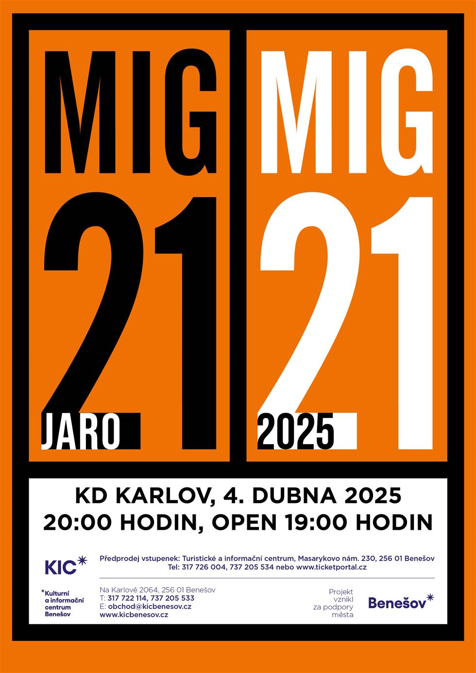 Hudební skupina Mig 21, která sama sebe nazývá jako „chlapecká, taneční, pěvecká a striptérská skupina z Prahy 5 - Smíchova”, navazuje na své podzimní turné řadou jarních koncertů.Po dvou unikátních, vyprodaných koncertech ve Foru Karlín a letních open-airech, se kapela vrací do ověřených a všemi milovaných klubů, kde si bude se svými fanoušky opět co nejblíž! Pomalu si dýchat z úst do úst, prostě těsně vedle sebe, jak také zpívají v textu jedné ze svých písní. „Neskutečně se těšíme, osaháme si nové prostory, ve kterých jsme nikdy nehráli, ale zároveň se se svými fanoušky potkáme v našich, už téměř domáckých, klubech! Ta intimita klubů nám dodává energii!“ podotýká zpěvák Jiří Macháček.Koneckonců kapela MIG 21 je proslulá tím, že to umí na pódiu pořádně rozjet, takže by byla velká škoda o jejich show přijít! Zahraje nejen své největší hity, ale zároveň představí své starší kusy v nových, netradičních úpravách, a fanoušci uslyší i zbrusu novou píseň, to vše podpořeno fantastickou vizuální show.Vstupné: 1. vlna od 11.11. 499 Kč, 2. vlna od 1.1.2025 549 Kč (předprodej) / 599 Kč (v den konání a na místě)